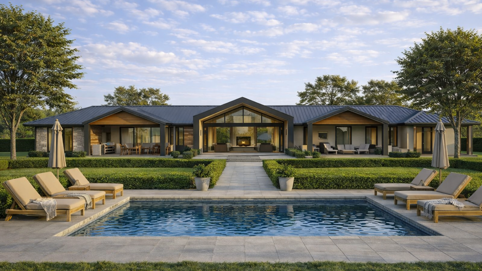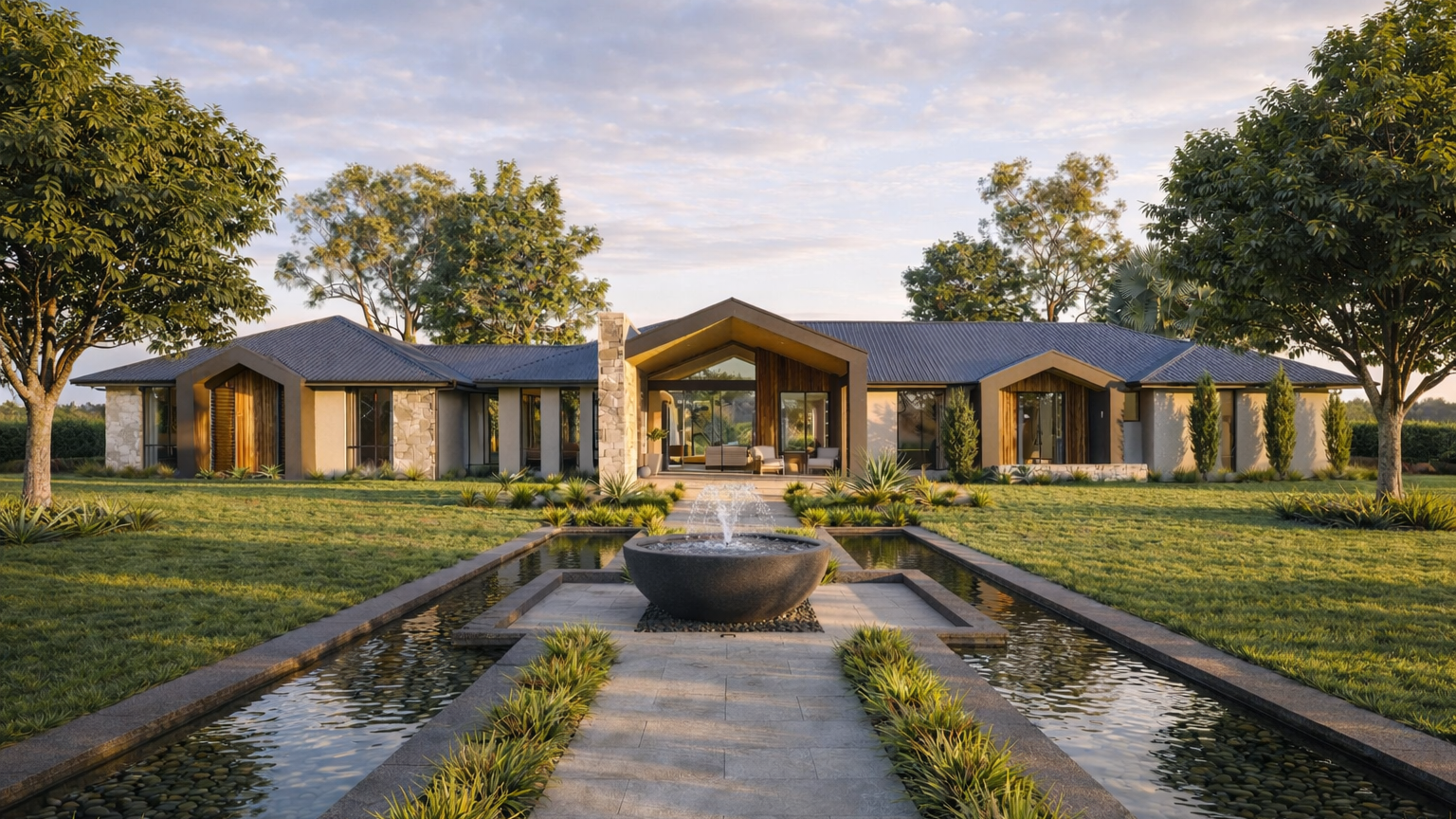 The Thornlands Homestead is a contemporary farmhouse designed for a multi-generational family, extending horizontally across the site to sit calmly within its landscape. The design is led by daily life rather than formal expression, with a carefully resolved plan that balances shared living with individual privacy.