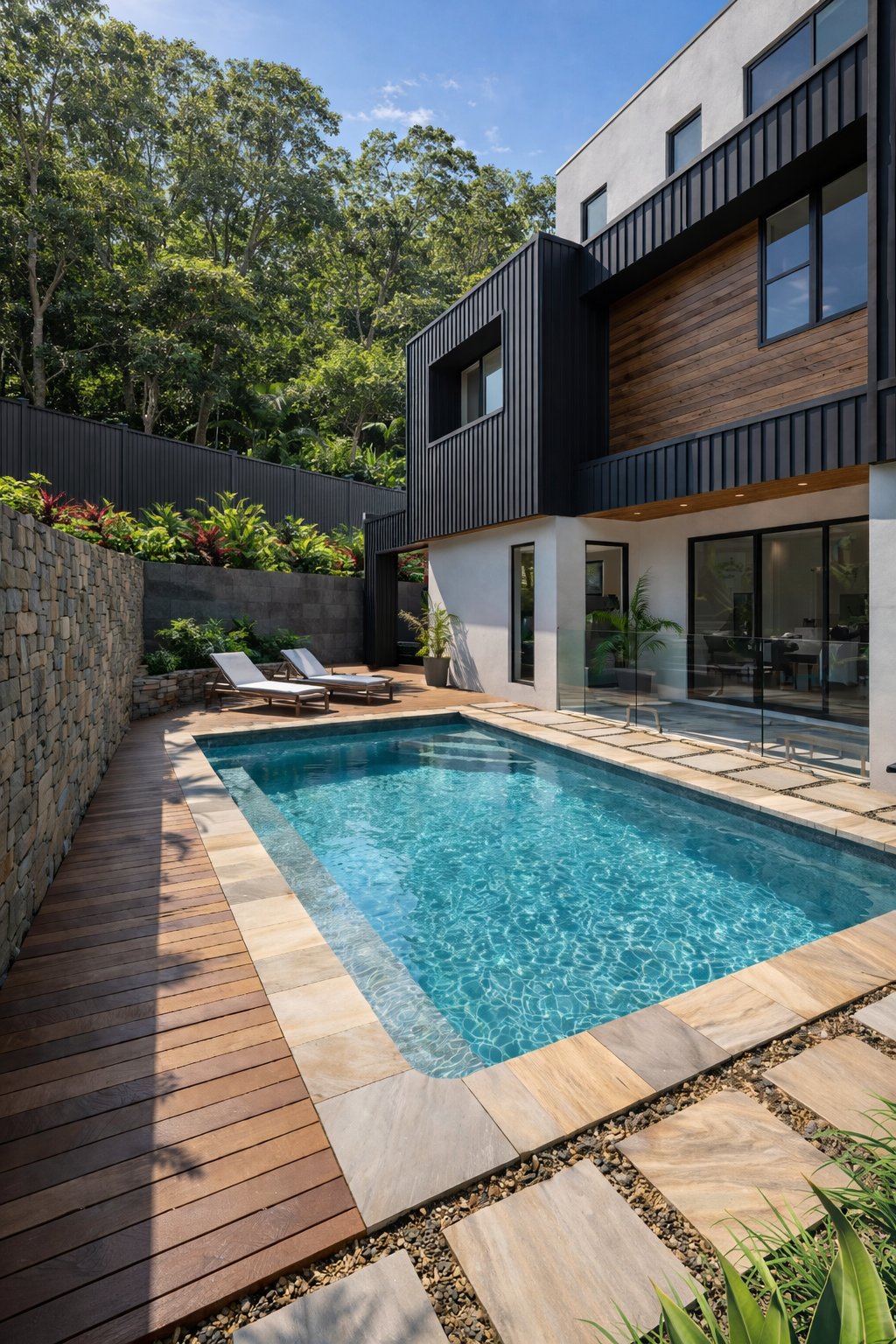 Arrival occurs at the lower level, where the garage and an open entry zone create a welcoming transition from street to home. The middle level forms the core of family life, accommodating the main living, dining and kitchen spaces with direct connections to the pool and outdoor areas. The upper level is reserved for the master suite, positioned to capture the best outlook while maintaining privacy from the more active spaces below.